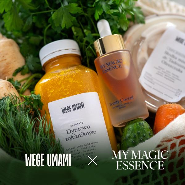 ANTY-OX to pięciodniowy program antyoksydacyjnej interwencji komórkowej. Od środka działa dieta profilaktyczna od Wege Umami, a od zewnątrz - serum do pielęgnacji twarzy od My Magic Essence. Przez 5 dni otrzymujesz 3 lekkostrawne pełnowartościowe posiłki, antyoksydacyjne smoothie (480 ml) i zestaw dodatków funkcjonalnych: zakwas buraczany, porcję kwasów omega, mieszankę do przygotowania naparu i błonnikową przekąskę WeJerky. Pierwszego dnia dostaniesz luksusowy kosmetyk: Beauty Coctail – Botanical Antiox Serum, które działa jak zastrzyk energii i od razu dodaje skórze blasku i sprężystości.